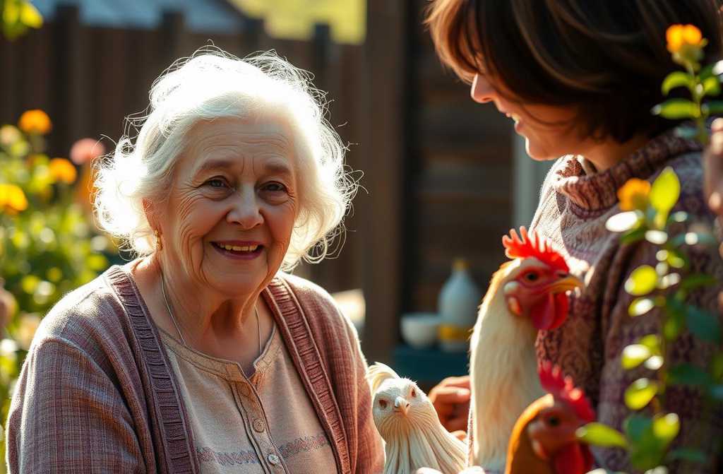 Она открыла дверь курятника. Оттуда высыпали семь кур. За ними важно вышагивал петух. Старушка рассыпала крошки по земле и направилась в уборную.