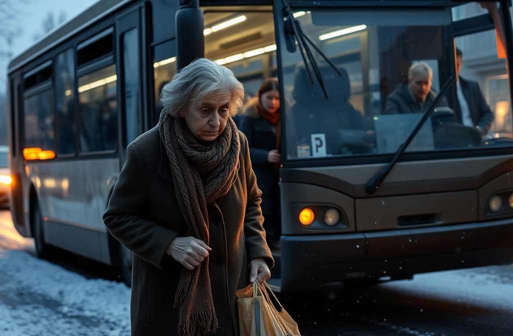 Пожилая женщина медленно двинулась к выходу. Каждый шаг давался с трудом. Двери распахнулись с резким шипением, и ледяной ветер ударил ей в лицо. Она замерла на ступеньке, уставившись на водителя.