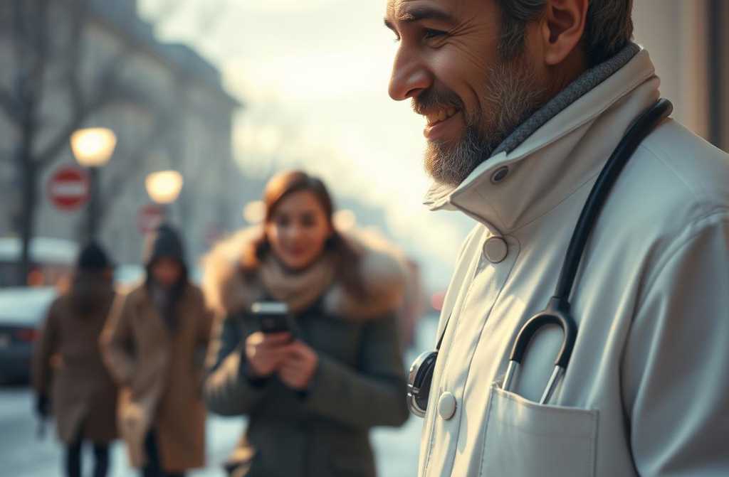 Молодой человек в тёплом пальто, из-под которого виднелся белый халат. Глаза усталые, но добрые.